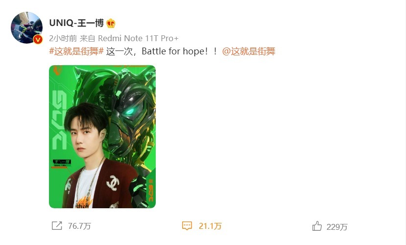 7月5日,王一博在自己的社交平台晒出《这!就是街舞5》的宣传海报,并配文:这一次,Battle for hope!(为希望而战!)这是官宣参加第五季了。